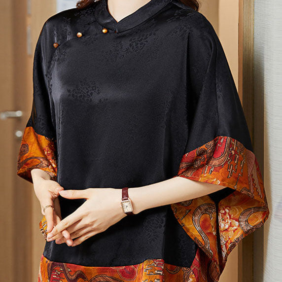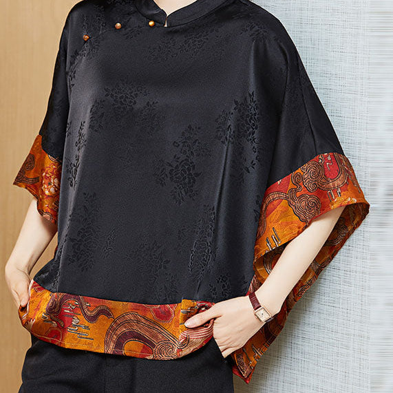 Vintage Black Mandarin Collar Asymmetrical Patchwork Jacquard Silk Shirts Batwing Sleeve