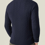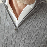 This zipped sweater in cable knit combines a textured knit with a zippered front for simple and reliable functionality. The cable pattern adds structure to the fabric. The zipper allows you to open or close the front to control warmth and airflow.